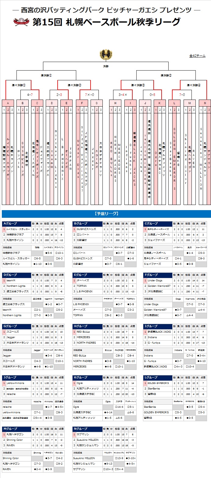 西宮の沢バッティングパーク ピッチャーガエシ プレゼンツ 第15回札幌ベースボール秋季リーグ 順位表(10/19終了現在)