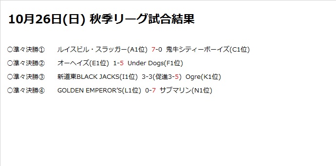 西宮の沢バッティングパーク ピッチャーガエシ プレゼンツ 第15回札幌ベースボール秋季リーグ 試合結果(10/26)