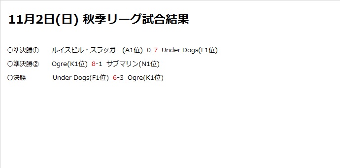 西宮の沢バッティングパーク ピッチャーガエシ プレゼンツ 第15回札幌ベースボール秋季リーグ 試合結果(11/2)