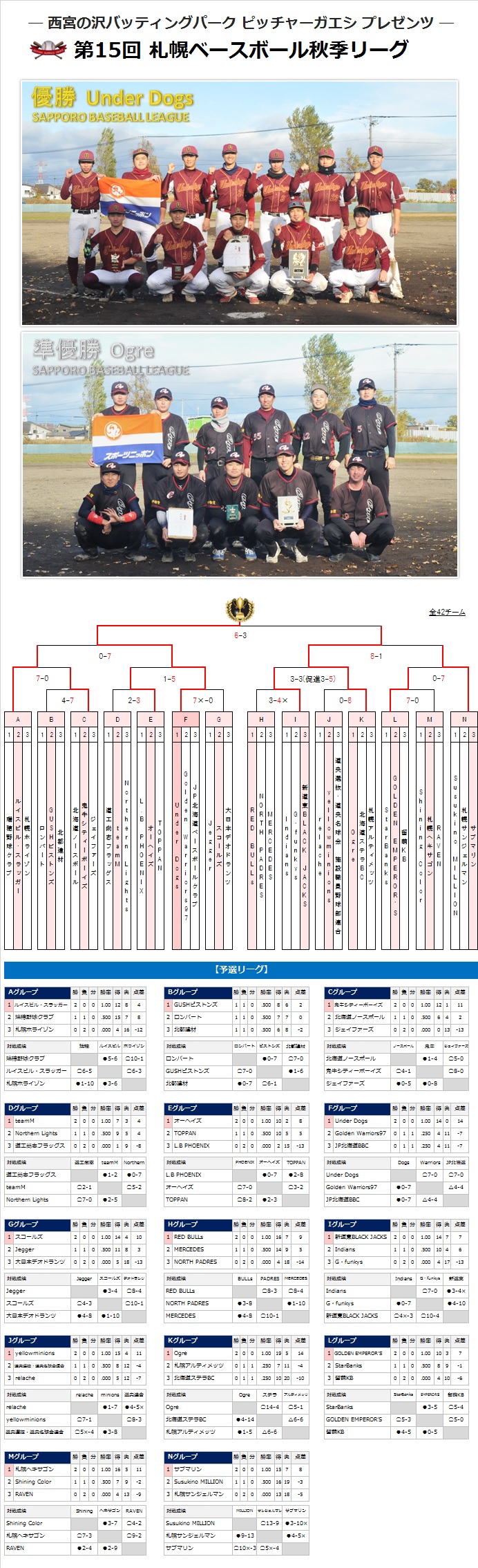 西宮の沢バッティングパーク ピッチャーガエシ プレゼンツ 第15回札幌ベースボール秋季リーグ 順位表(11/2全日程終了)